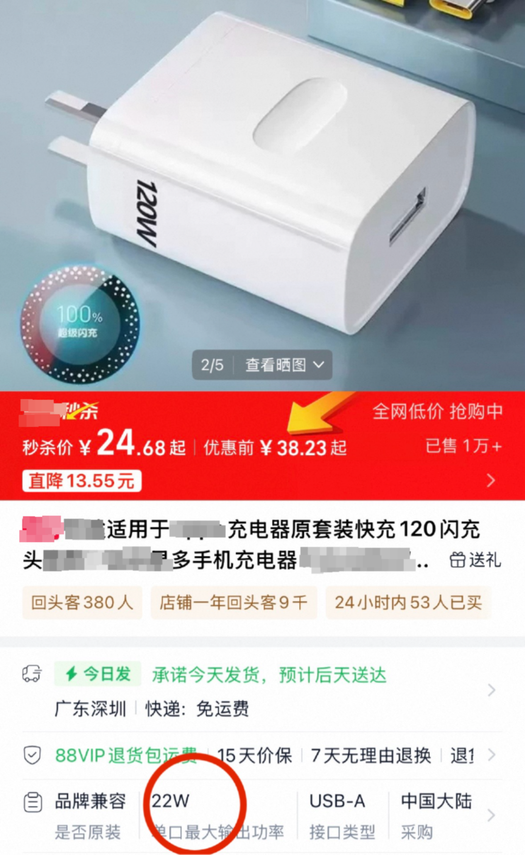 那么,是否存在虚标?记者以消费者的身份随机询问了三家客服。一家客服人员避重就轻,只是回答“是自主品牌适用款”,记者再度追问功率是否有120W,对方回答“达不到原装的效果”并强调“有标注是适用款”。在多次追问实际功率后,客服表示“详情页有标注”。这时,记者才注意到,产品参数中,“单口最大输出功率”为22W。