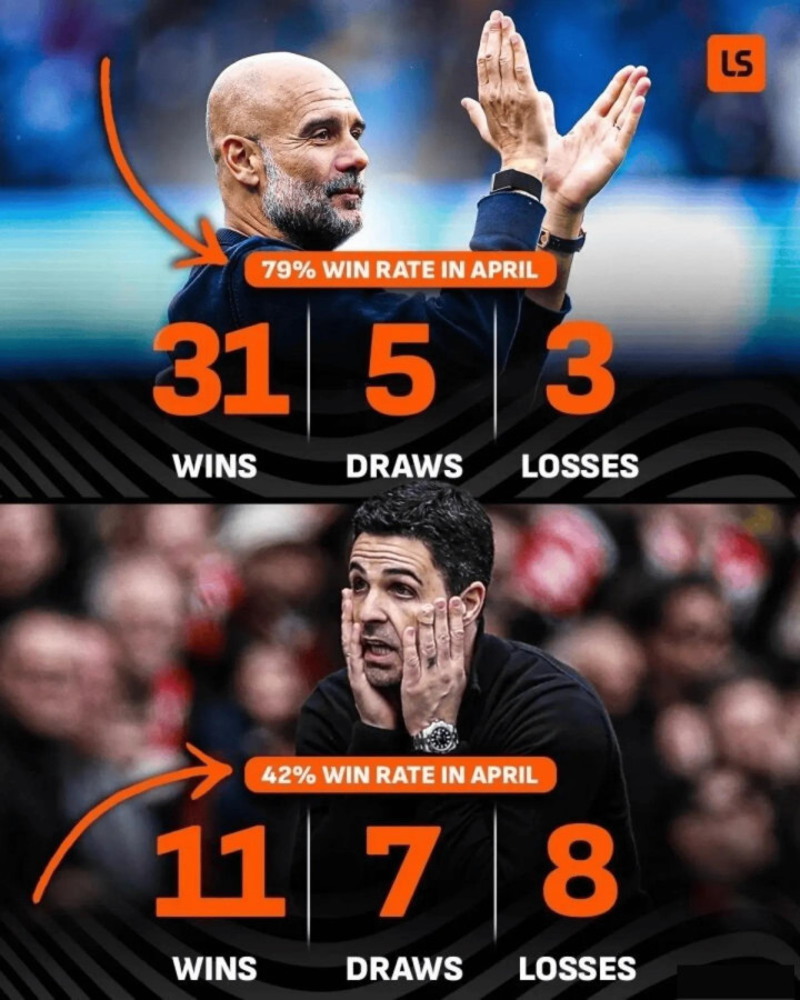 数据不说谎,根据Livescore的统计,瓜迪奥拉执教球队在英超表现最好的月份恰好就是在4月,历史战绩是31胜5平3负,胜率高达79%。