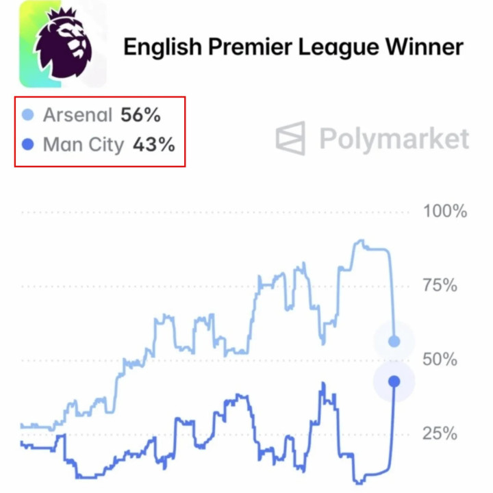 在上轮英超踢完之后,数据机构Polymarket Sports更新了阿森纳与曼城的夺冠概率。前者从91%暴跌到56%,曼城则攀升到了43%。